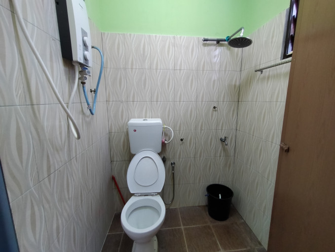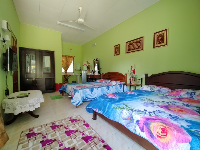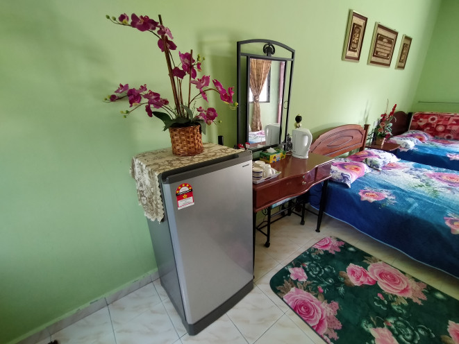 A room with two queen bed equipped with TV, Njoi Decorder, refrigerator, bathroom with water heater.